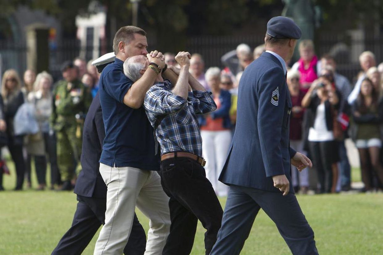 the civilian onlookers onto the Queen’s grass, unfolded my “Stop
